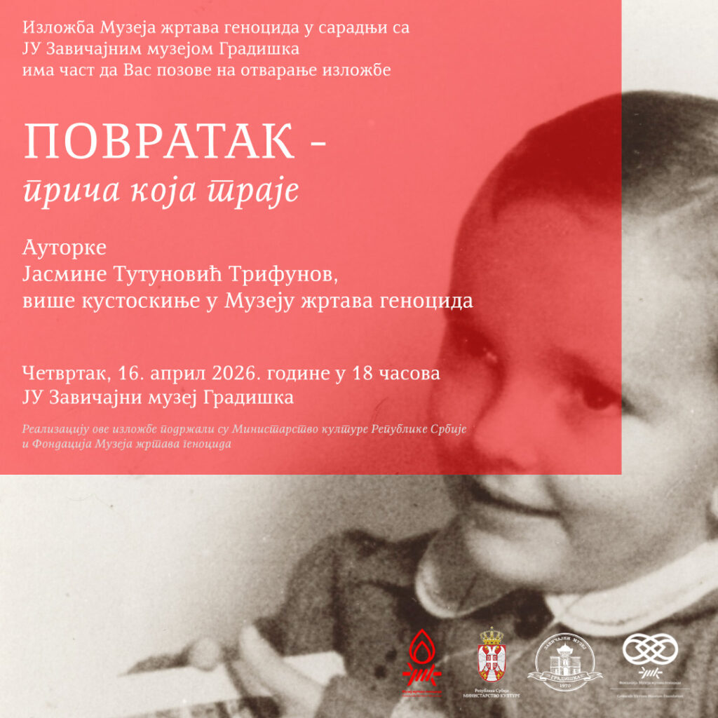 Градишка, 16. април 2026. године – Изложба „Повратак – прича која траје“, ауторке Јасмине Тутуновић Трифунов, вишег кустоса Музеја жртава геноцоида, отворена је у Завичајном музеју Градишка.